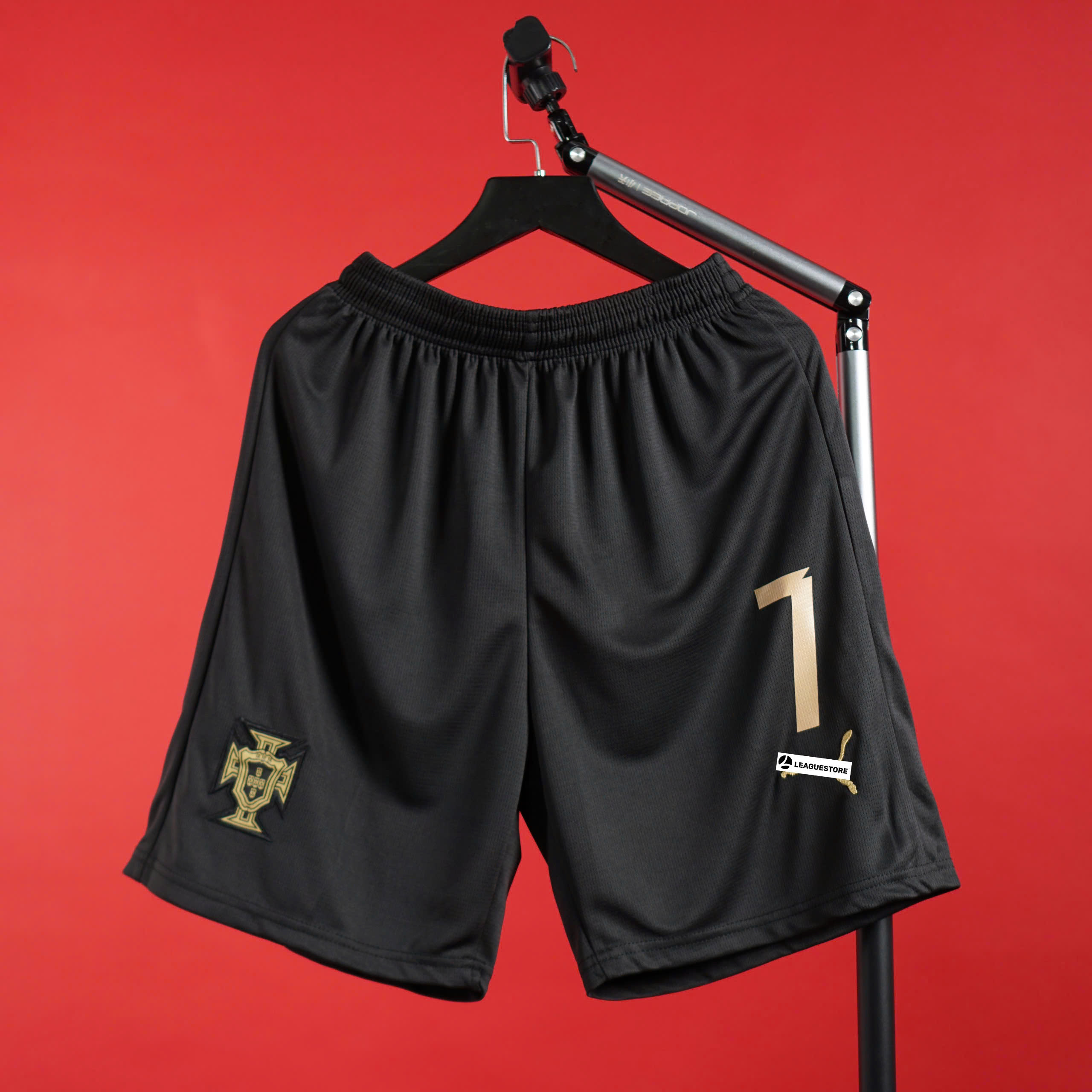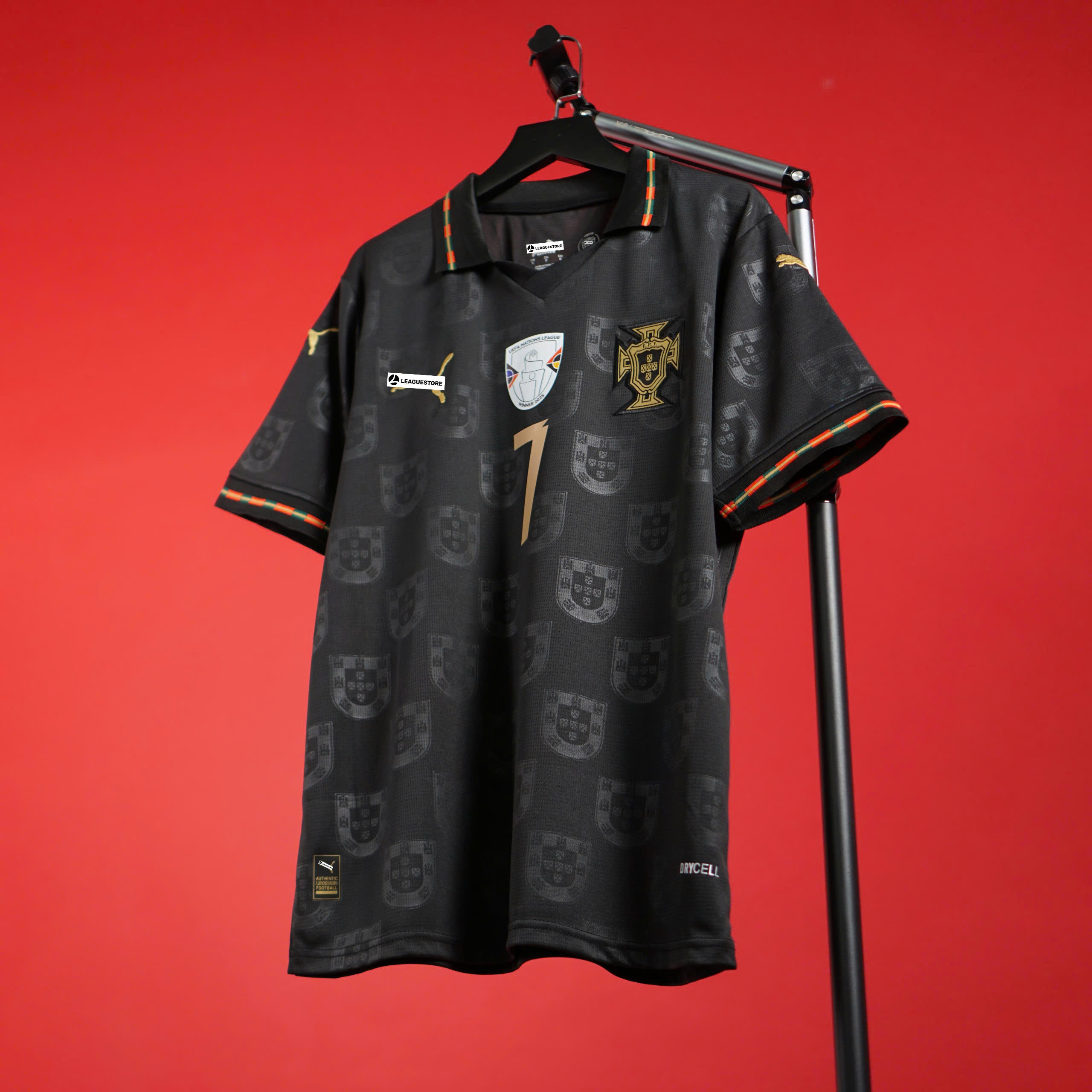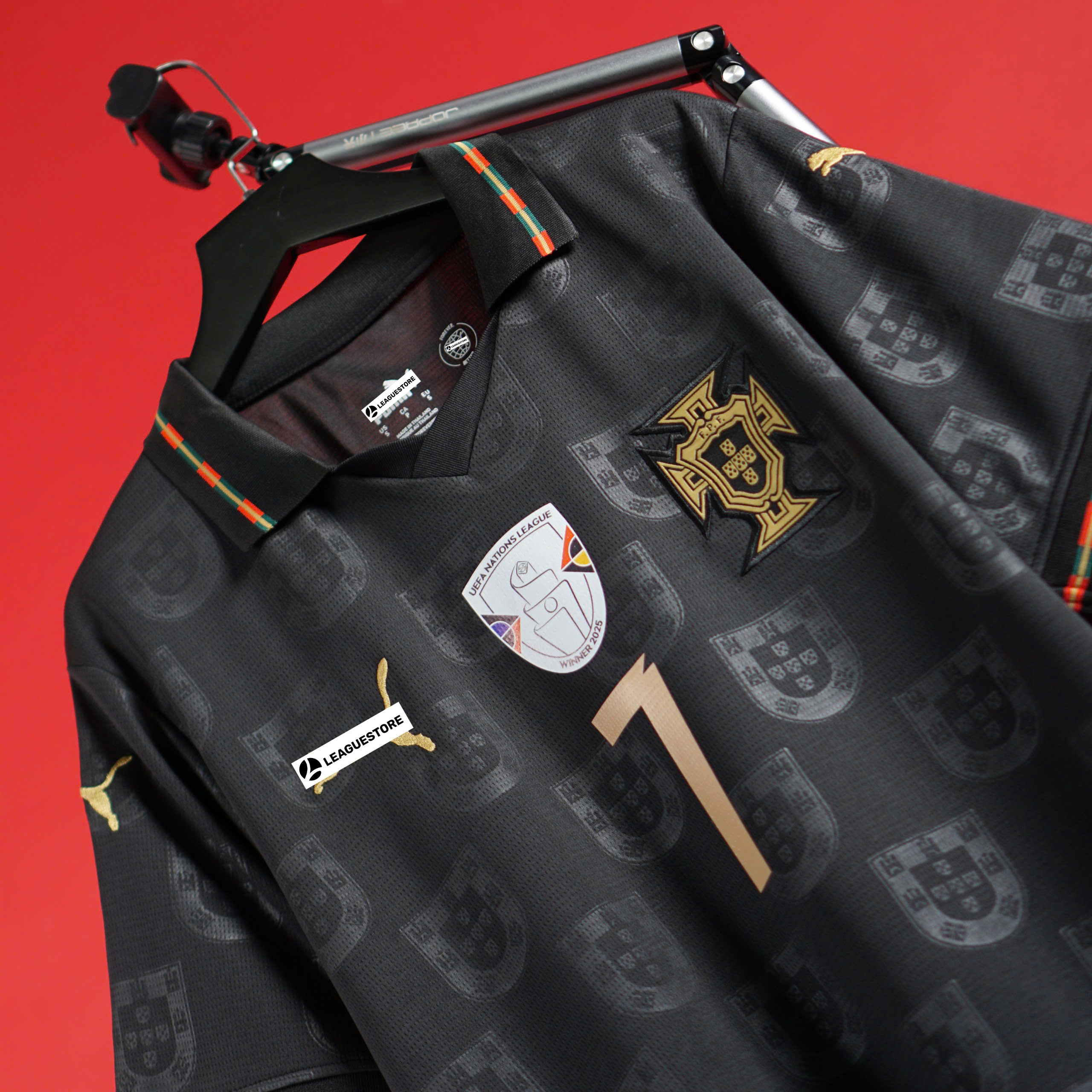 Logo: Quốc huy Bồ Đào Nha + số 7 in ép sắc nét; logo gold thêu một phần