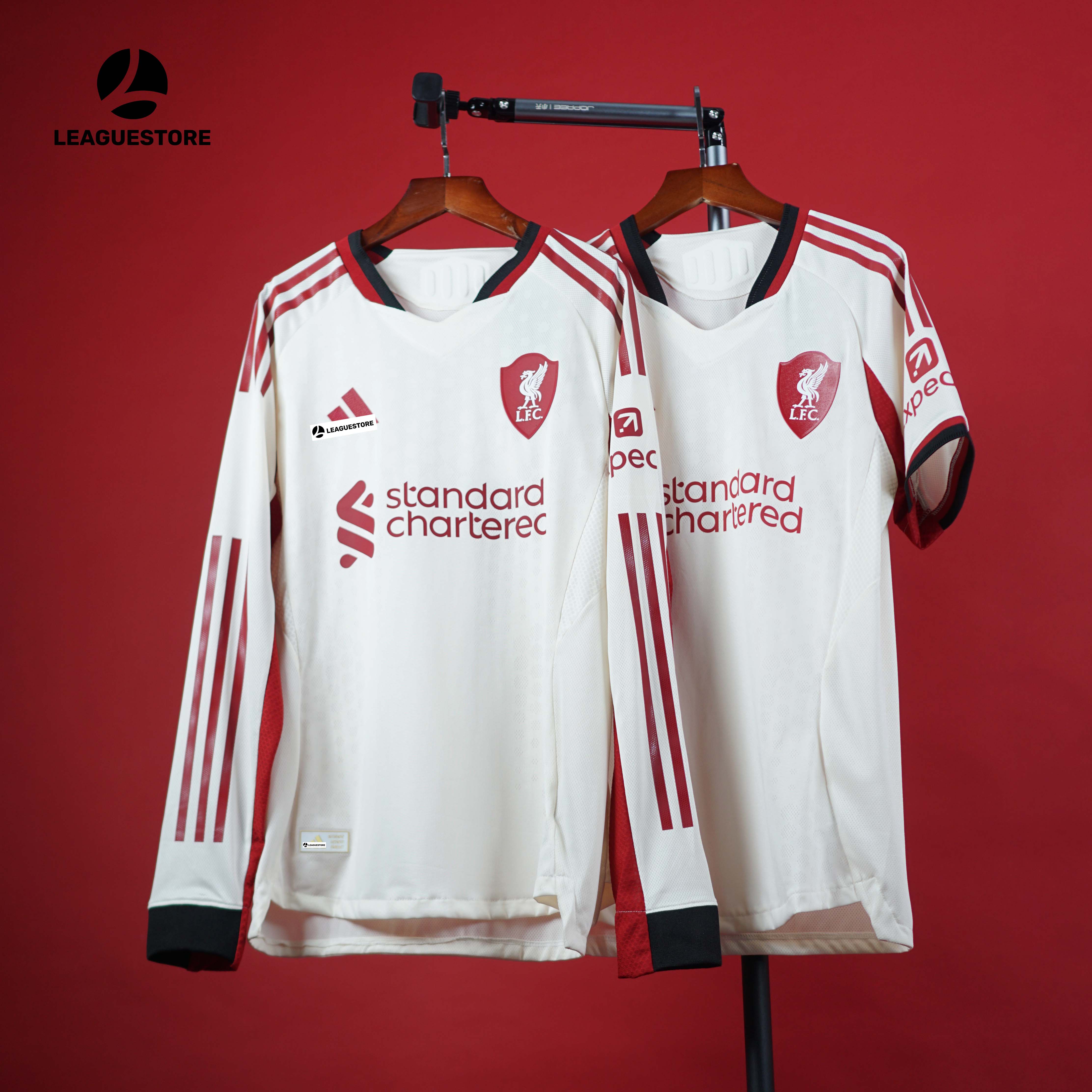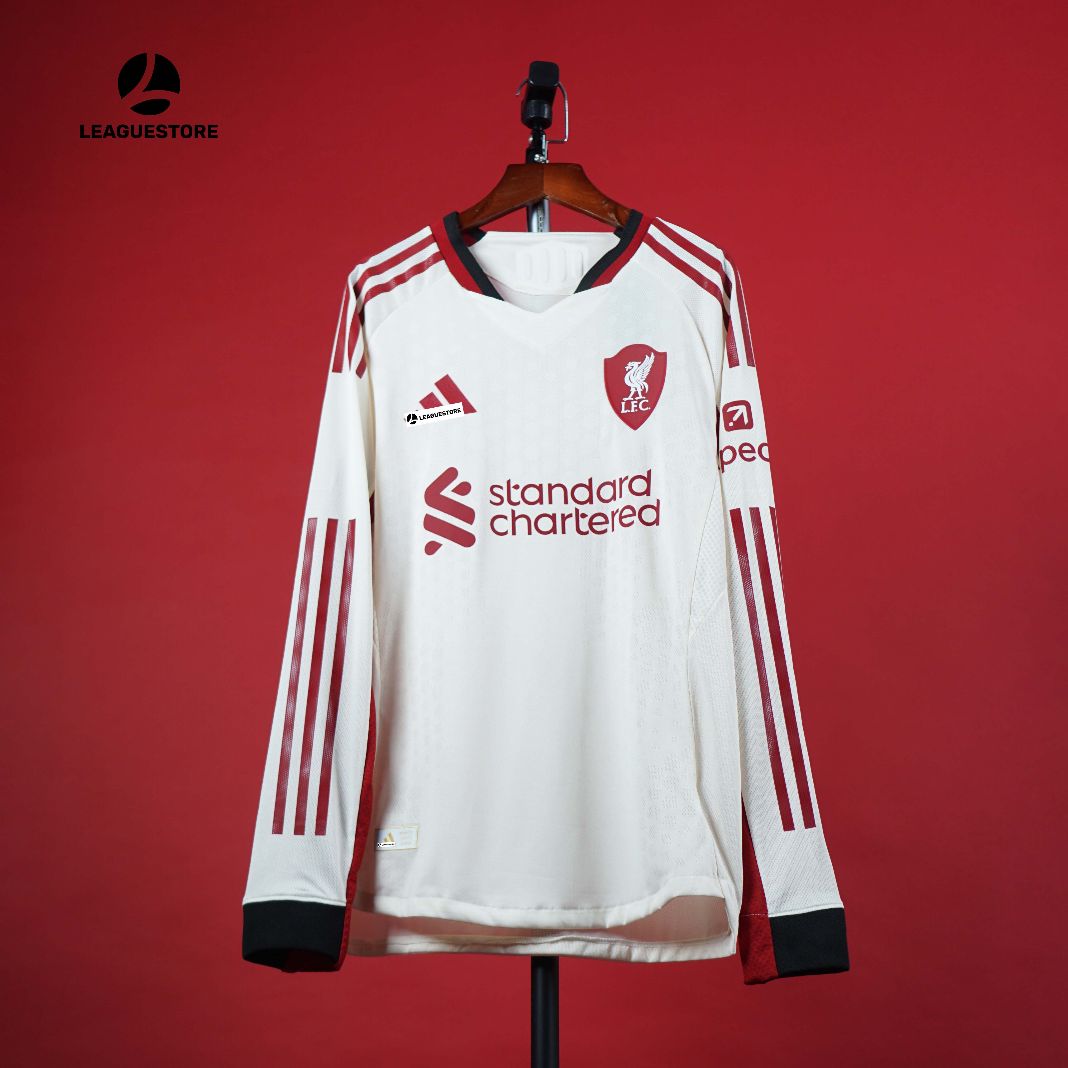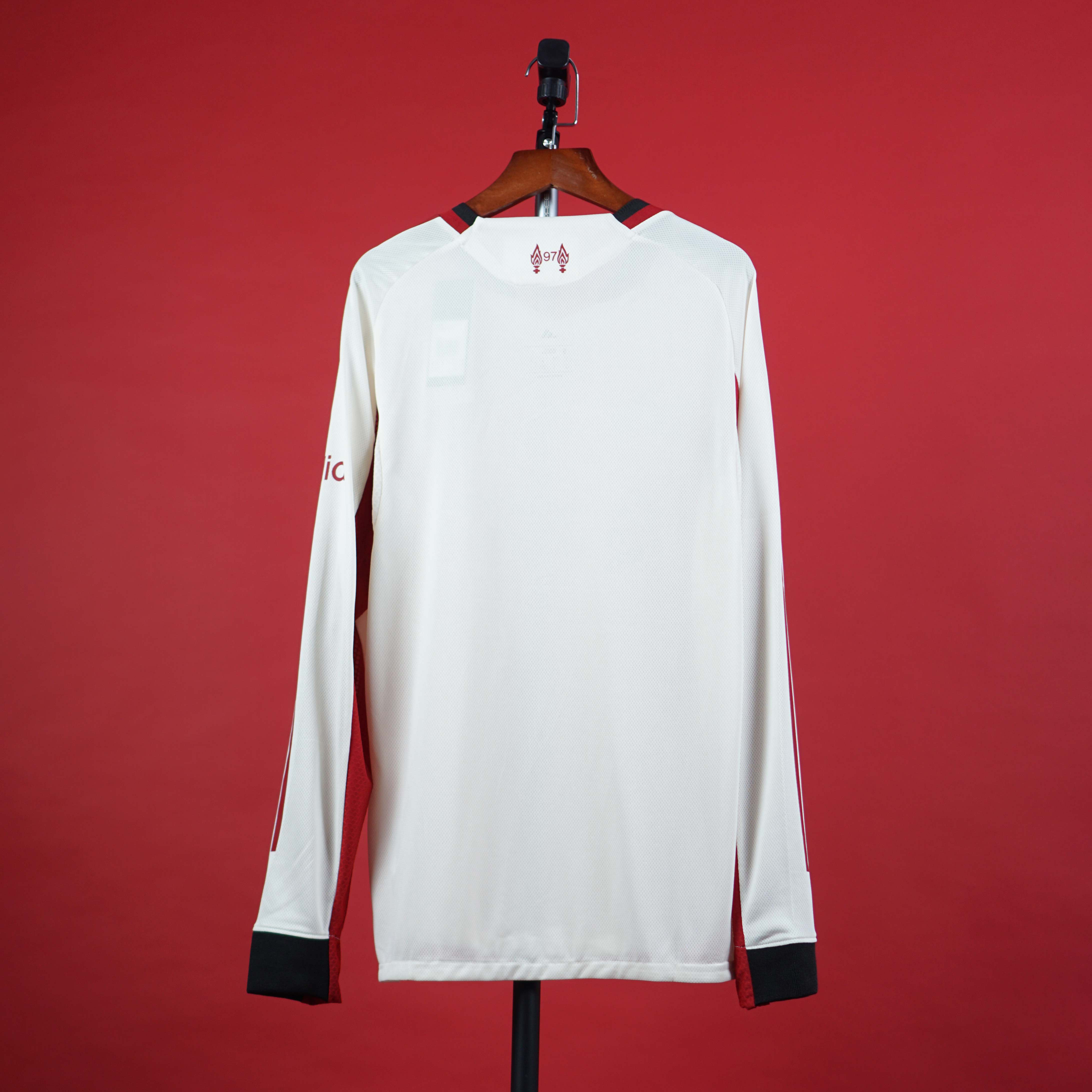 Mùa giải 2025/26 chứng kiến Liverpool ra mắt mẫu áo đấu sân khách dài tay đầy tinh tế và mạnh mẽ. Thiết kế trắng phối đỏ đô sang trọng, cổ tim viền đen lịch lãm kết hợp tay dài thể thao – dành riêng cho fan đích thực của The Kop.