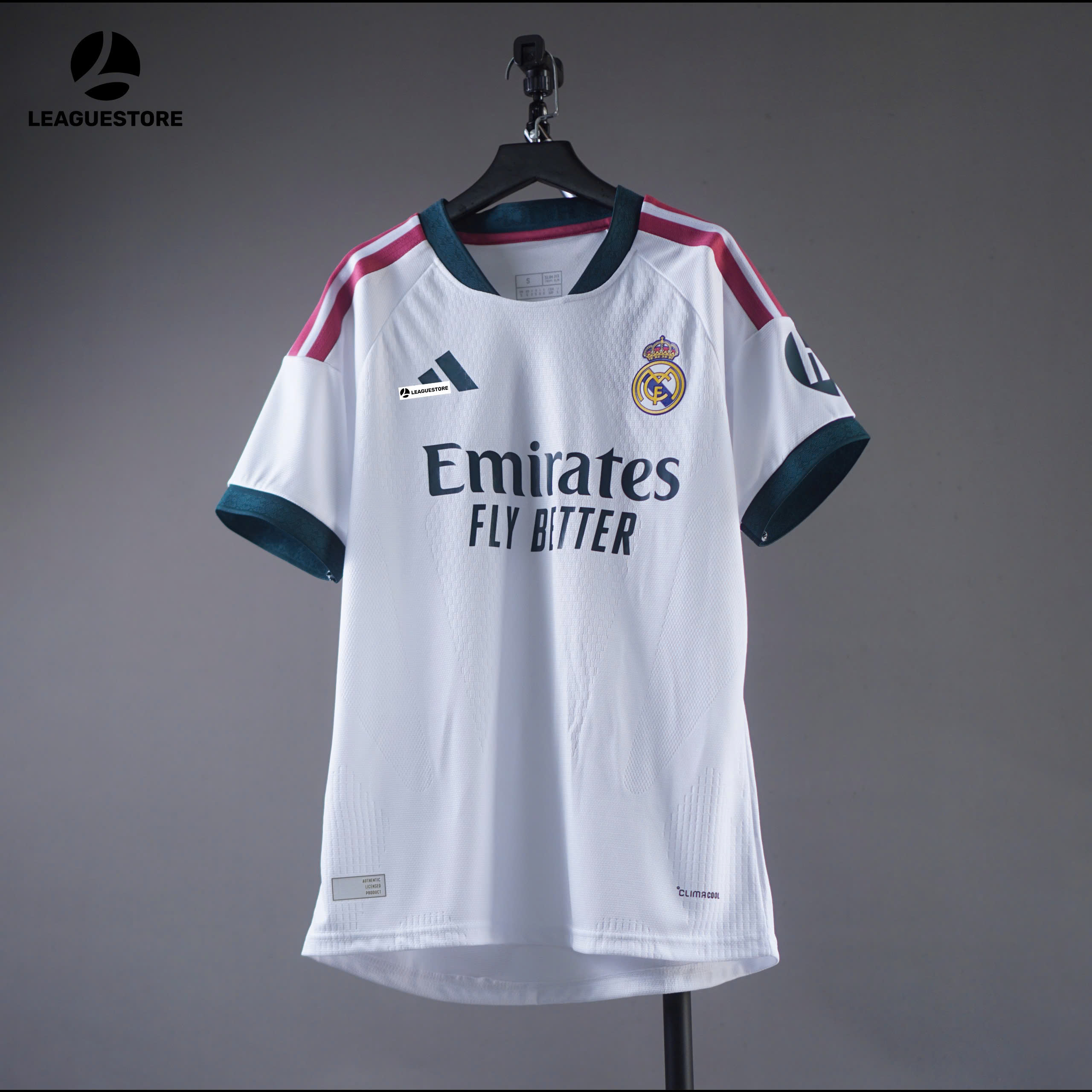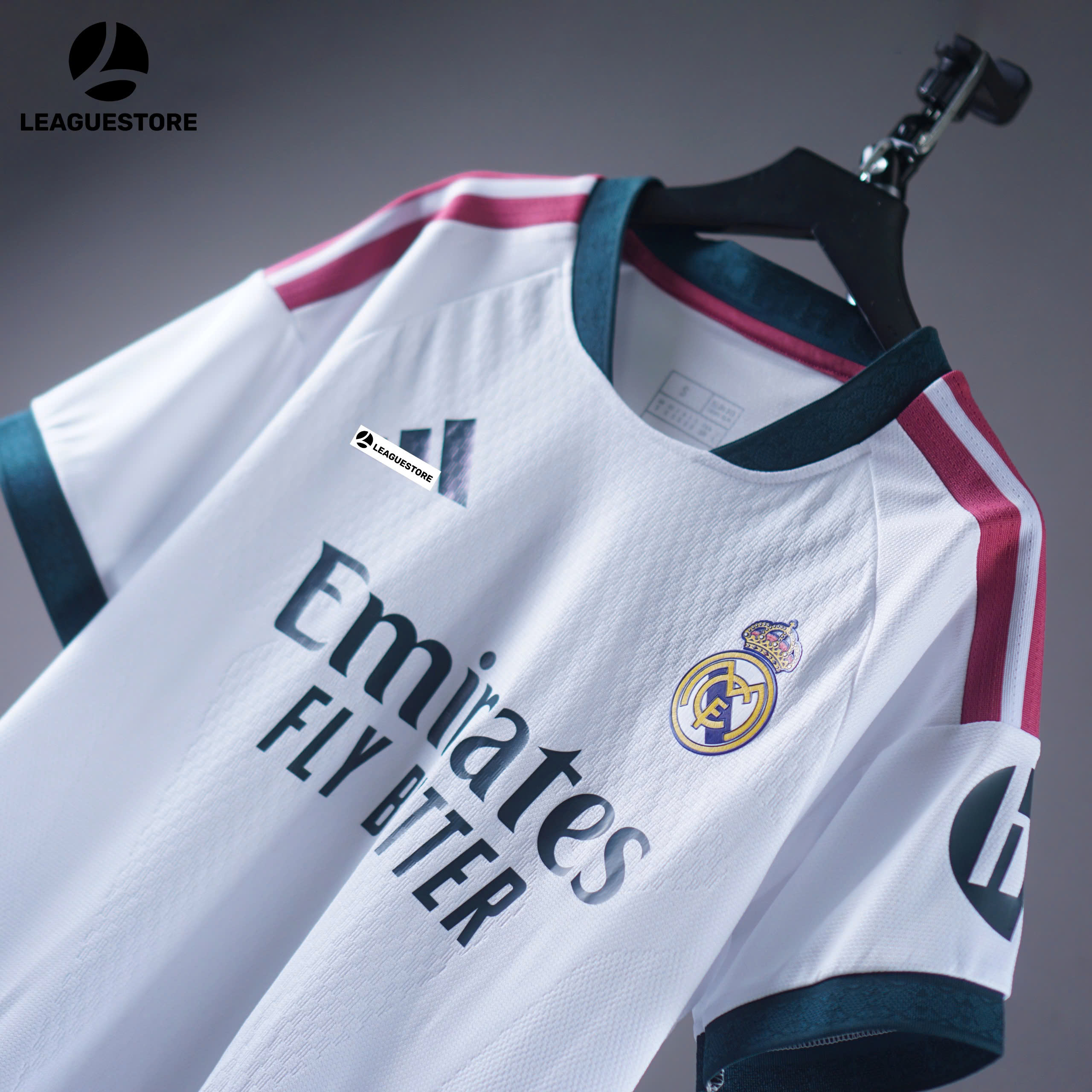 Mẫu sân nhà Real Madrid 26/27 giữ nguyên tinh thần trắng hoàng gia huyền thoại, kết hợp điểm nhấn hồng – xanh đậm hiện đại ở vai và cổ áo, tạo nên vẻ ngoài vừa truyền thống vừa cực kỳ thời thượng.